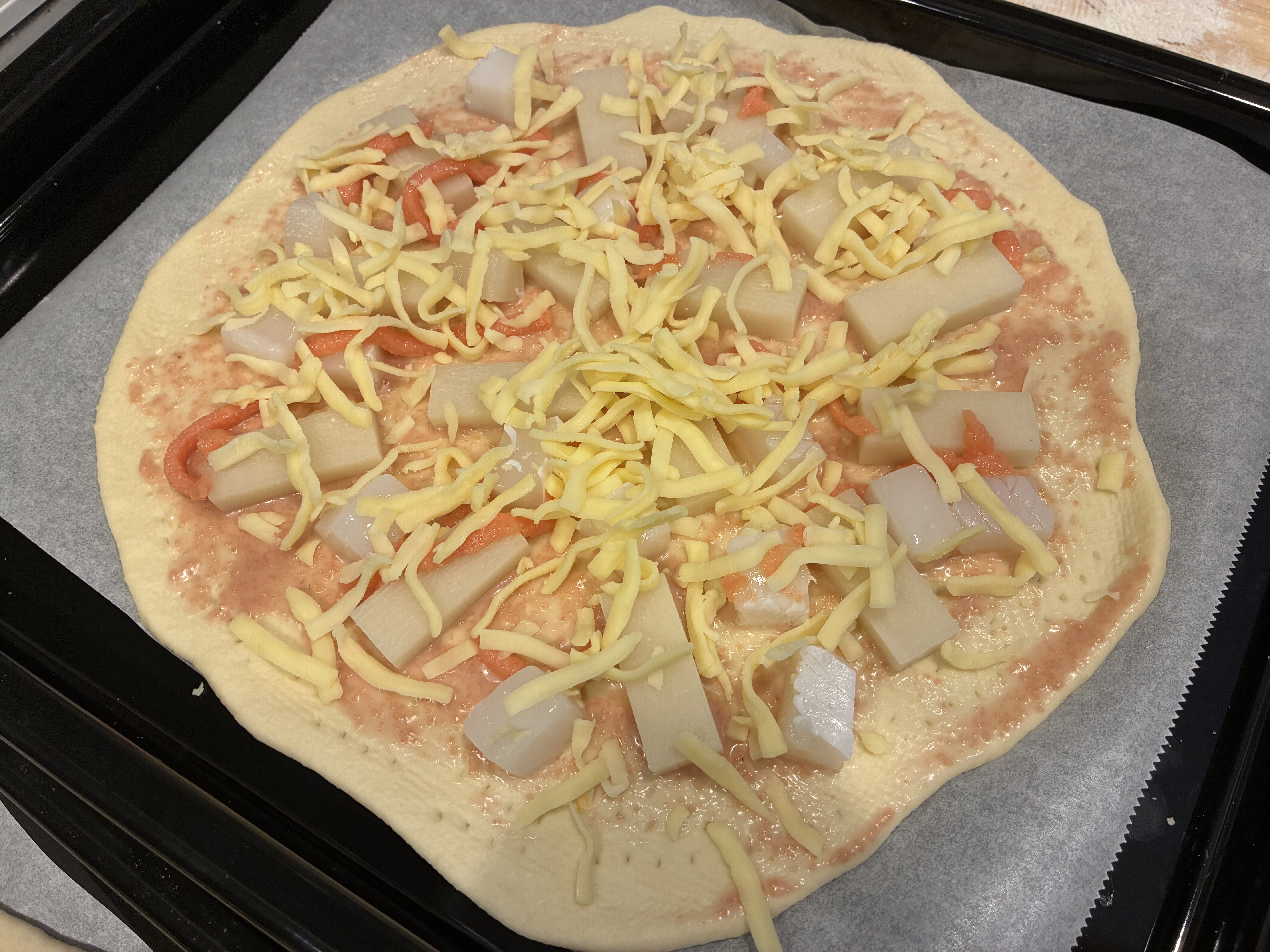 地元のピザチェーンの「明太子とお餅のピザ」からアイデアを頂戴しました♪