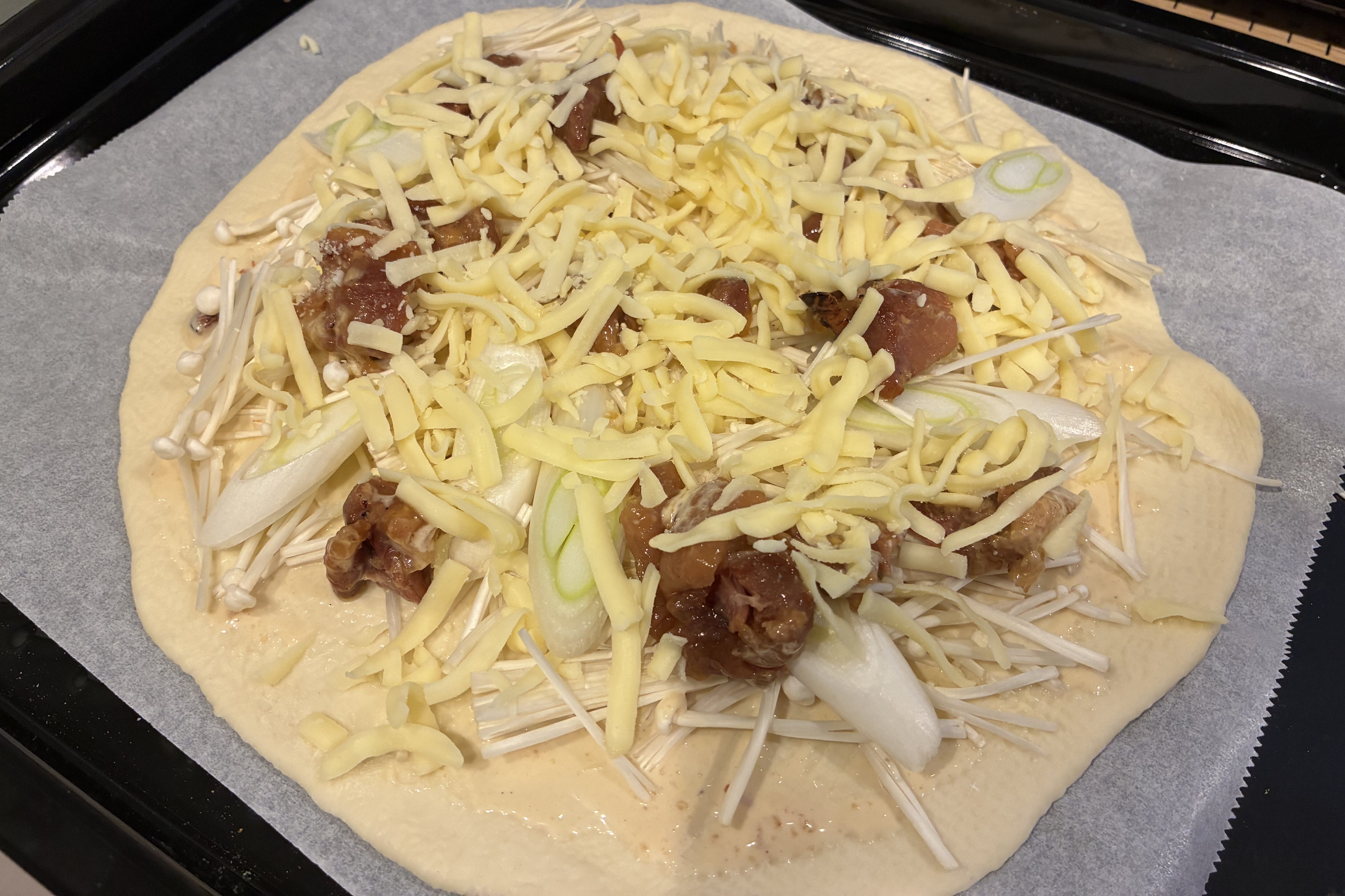 タレ部分とマヨネーズ少量を合わせたものをソースにします。えのきやネギ、焼き鳥とチーズを乗せて焼きます。