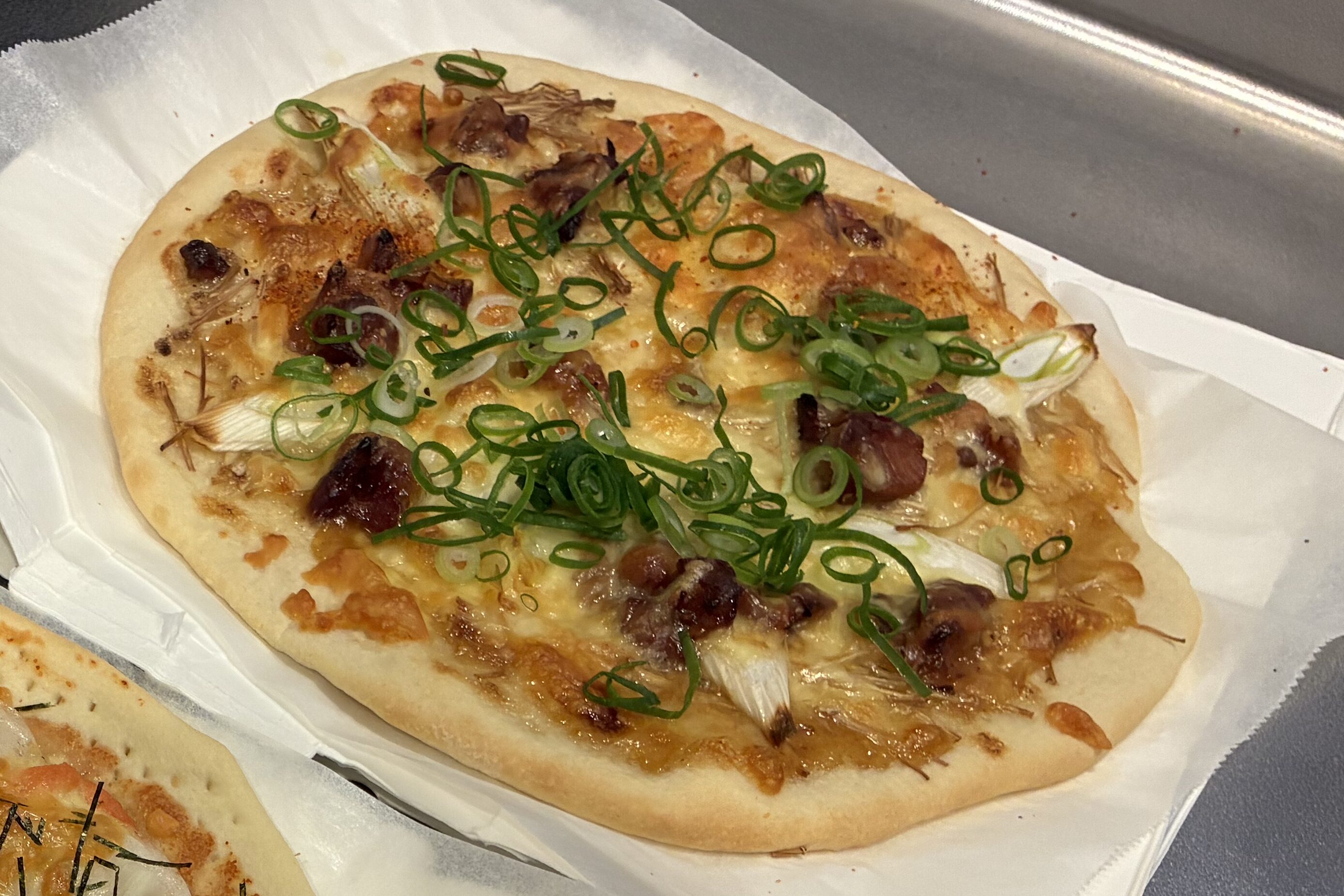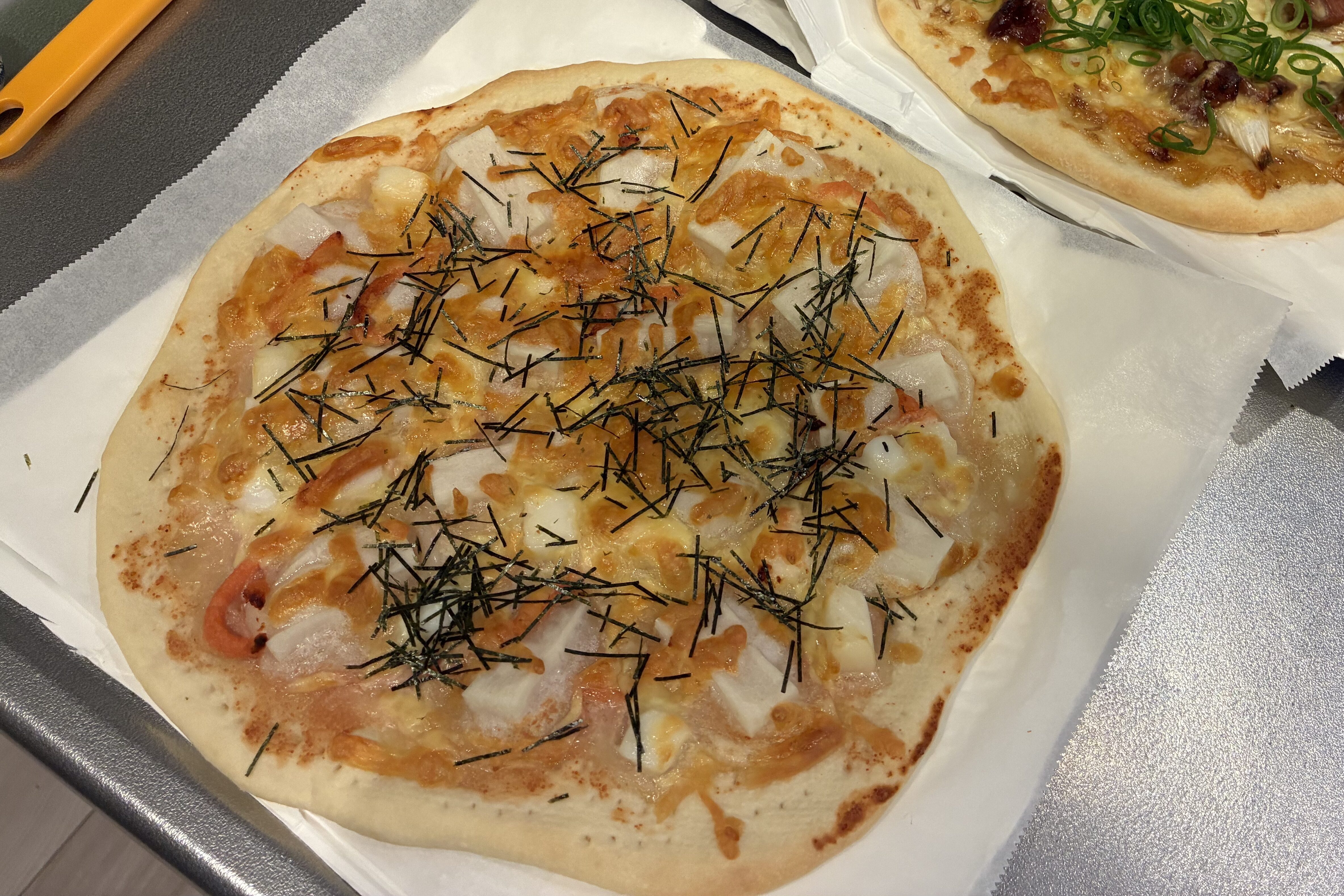 大人は七味や柚子胡椒をかけてみてください。ビールやハイボールが進む、おつまみにも好適なピザになります♪