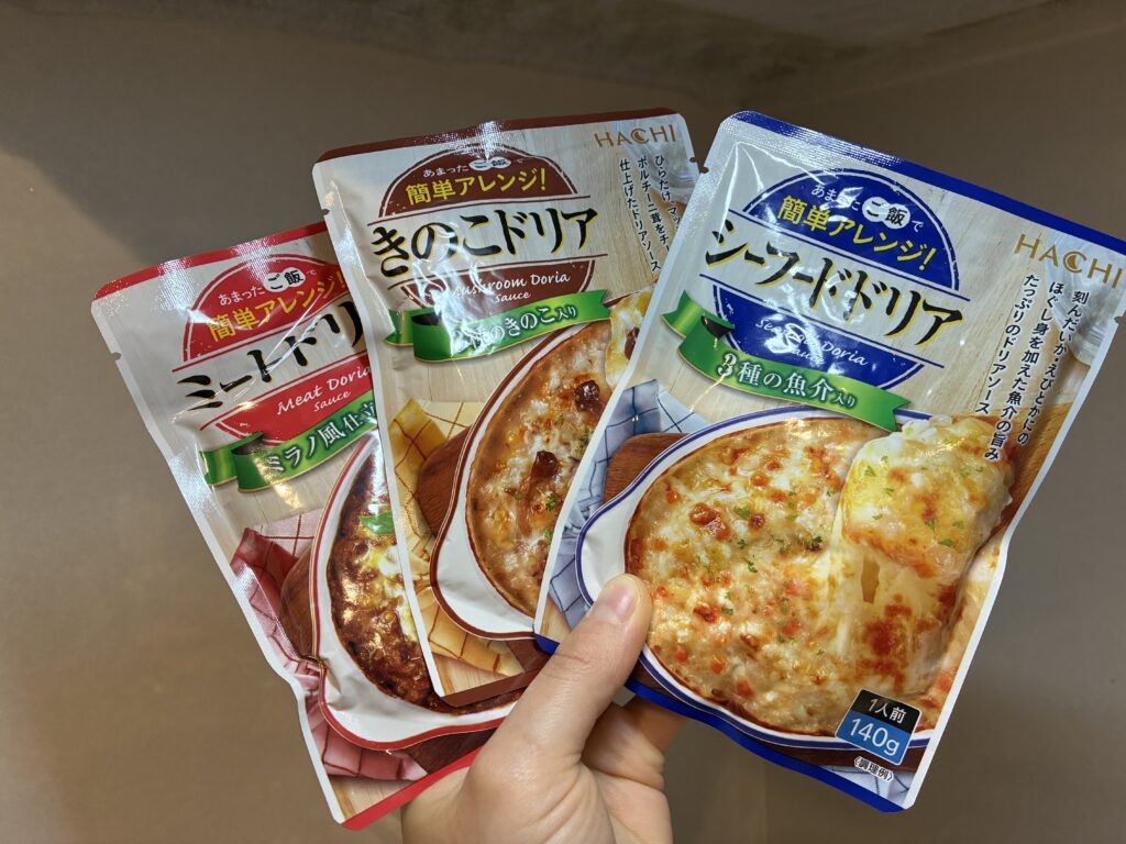 我が家でピザソース用に常備しているのが、これ。業務スーパーのドリアソースシリーズです。